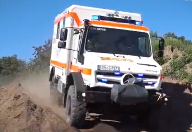Mercedes Unimog U 4023,德國制造的堅(jiān)固可靠的車輛。可以為偏遠(yuǎn)地區(qū)的人提供醫(yī)療服務(wù),車輛長6米,總重量為10.3噸。配備了自恢復(fù)絞盤輪胎充氣系統(tǒng)。發(fā)動機(jī)功率為231馬力,最高時(shí)速是89公里每小時(shí)??梢源┰缴稚矫}等困難的地形。也可以穿越水深1.2米的區(qū)域。