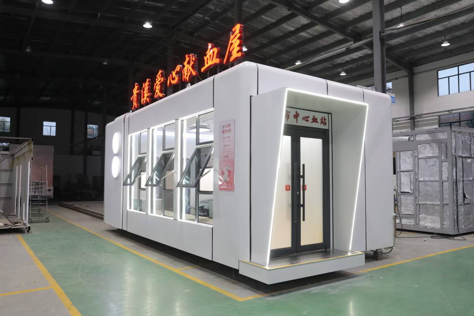 無(wú)償獻(xiàn)血讓愛傳遞,移動(dòng)獻(xiàn)血屋有30幾平方米。可以配備LCD廣告顯示屏,用于播放日常的愛心獻(xiàn)血宣傳廣告。然后做了一個(gè)大大的愛心造型,三層中空的鋼化玻璃的整個(gè)采光透光性是非常好的。它是屬于鏡面玻璃,外面看不到里面,從里面可以看到外面,可以起到一個(gè)很好的隱私保護(hù)作用。獻(xiàn)血屋的外墻采用全鋁材質(zhì),大門是雙拉門配備指紋密碼鎖。外觀設(shè)計(jì)簡(jiǎn)潔大方的,色調(diào)為暖色調(diào)紅色白色為主。進(jìn)門的是前臺(tái)區(qū)域,用于正常的登記,體檢臺(tái)、化驗(yàn)臺(tái)、等候區(qū)、采血區(qū)、休息區(qū)。還有更衣室,可以供獻(xiàn)血人員和醫(yī)護(hù)人員更換衣服。洗手池,柜子可以放微波爐、咖啡機(jī)等。有沙發(fā)可以供獻(xiàn)血者來(lái)休息,采血區(qū)域配備了采血臺(tái)、采血椅熱合臺(tái)。還有儲(chǔ)存血液的冰箱。機(jī)采椅既可以坐也可以躺著采血。還可以上下調(diào)節(jié)。坐起來(lái)非常的舒坦。大大提高采血人員的舒適度。還剩余的空間放置機(jī)采設(shè)備。儲(chǔ)存柜可以讓獻(xiàn)血者放私人用品。