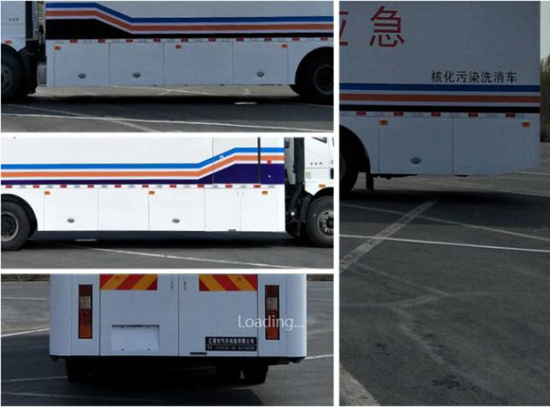 5. 核化污染洗消車潔凈區(qū)包括全身紅外烘干設(shè)備、座椅、毛巾柜、衣柜和控制臺(tái)并設(shè)置有照明、空調(diào)和新風(fēng)系統(tǒng)。本發(fā)明的積極效果在于:移動(dòng)展開迅速,可快速抵達(dá)突發(fā)事件現(xiàn)場(chǎng)開展被污染人員洗消;不僅自帶水箱和洗消液箱,功能齊全,布局合理,還可外接水源供水,并可實(shí)時(shí)補(bǔ)充洗消液,自帶的水箱和洗消液可滿足125 人次去污洗消具有操作方便、行動(dòng)快捷、自動(dòng)化程度高,符合國(guó)際醫(yī)學(xué)救援規(guī)范和國(guó)家標(biāo)準(zhǔn),符合核化污染人員去污洗消流程和規(guī)范;滿足應(yīng)急救援快速需求,洗消車范圍設(shè)計(jì)制造,功能齊全,配備有車輛實(shí)時(shí)衛(wèi)星定位、.洗消后放射性水平檢測(cè)、核素識(shí)別功能,功能全;內(nèi)外光潔、不易沾染、便于去污、可重復(fù)多次使用;.它不僅可以快速抵達(dá)核化突發(fā)事件現(xiàn)場(chǎng)開展被核化污染人員的現(xiàn)場(chǎng)去污洗消,又可停放在核化損傷救治基地和定點(diǎn)醫(yī)院作為二次洗消用房。是核化突發(fā)事件放射性物質(zhì)或化學(xué)物質(zhì)污染人員去污洗消必配裝備。