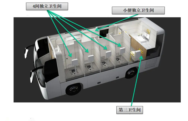 各類大型會展、賽事、文娛活動保障往往有突發(fā)較大的如廁需求。后勤保障車整車長12米,寬2.55米,高3.6米,內(nèi)高大于等于1.9米。司機(jī)區(qū)域獨立,有兩個座位,配備獨立空調(diào)。是真空型環(huán)保廁所是用于人員大小便的專用作業(yè)車。搭載馬桶、蹲便器、洗手池等專用裝備,既相互獨立,又互相關(guān)聯(lián)??商峁?人同時入廁使用。利用真空將便器內(nèi)的污物抽吸到真空泵,經(jīng)粉碎后,再將污物輸送到污物箱,同時吸附異味,使整個廁所干凈、整潔、移動方便。滿足多人如廁的需求,且無需外接水電,方便現(xiàn)場保潔。精準(zhǔn)到位,快速保障,有效降低了人力和時間成本,提高了使用效率。取消原車風(fēng)道,降低平地板,增加了原有使用空間,整車根據(jù)不同功能需求分區(qū)布局,充分采用新技術(shù),滿足人們對生活品質(zhì)的追求;節(jié)約資源,轉(zhuǎn)場效率高。滿足人們的如廁需求。大大節(jié)省了傳統(tǒng)廁所建設(shè)的人力、物力財力。