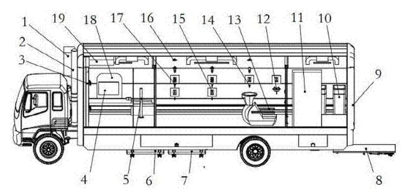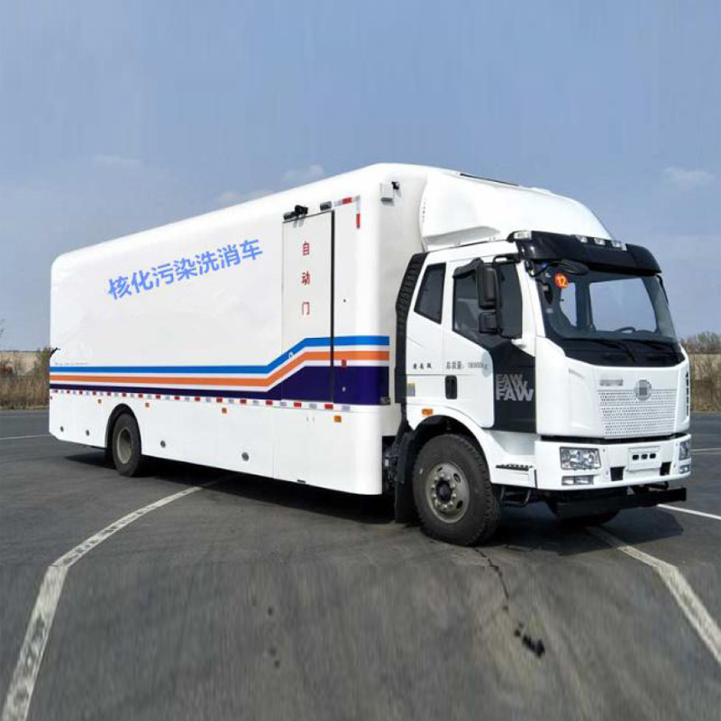 5. 核化污染洗消車潔凈區(qū)包括全身紅外烘干設(shè)備、座椅、毛巾柜、衣柜和控制臺(tái)并設(shè)置有照明、空調(diào)和新風(fēng)系統(tǒng)。本發(fā)明的積極效果在于:移動(dòng)展開迅速,可快速抵達(dá)突發(fā)事件現(xiàn)場(chǎng)開展被污染人員洗消;不僅自帶水箱和洗消液箱,功能齊全,布局合理,還可外接水源供水,并可實(shí)時(shí)補(bǔ)充洗消液,自帶的水箱和洗消液可滿足125 人次去污洗消具有操作方便、行動(dòng)快捷、自動(dòng)化程度高,符合國(guó)際醫(yī)學(xué)救援規(guī)范和國(guó)家標(biāo)準(zhǔn),符合核化污染人員去污洗消流程和規(guī)范;滿足應(yīng)急救援快速需求,洗消車范圍設(shè)計(jì)制造,功能齊全,配備有車輛實(shí)時(shí)衛(wèi)星定位、.洗消后放射性水平檢測(cè)、核素識(shí)別功能,功能全;內(nèi)外光潔、不易沾染、便于去污、可重復(fù)多次使用;.它不僅可以快速抵達(dá)核化突發(fā)事件現(xiàn)場(chǎng)開展被核化污染人員的現(xiàn)場(chǎng)去污洗消,又可停放在核化損傷救治基地和定點(diǎn)醫(yī)院作為二次洗消用房。是核化突發(fā)事件放射性物質(zhì)或化學(xué)物質(zhì)污染人員去污洗消必配裝備。
