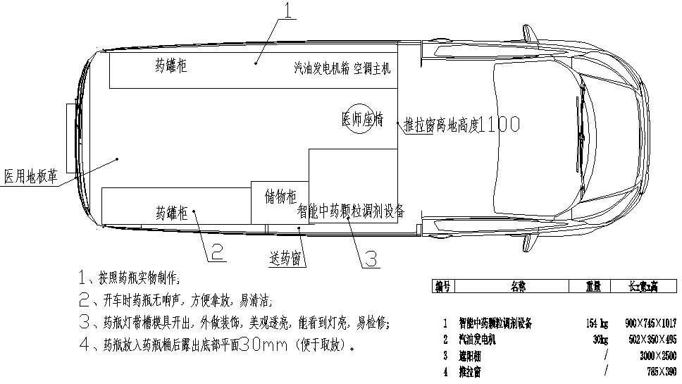 移動中藥房車車廂頂部安裝LED滾動屏,顯示接口與發(fā)藥設(shè)備對接,顯示所發(fā)藥品名稱。頂部還安裝紫外燈以便對整個車廂進行殺菌。車輛有GPS,車內(nèi)提供5G(含4G)網(wǎng)絡(luò)連接。配置了駐車空調(diào)和行車空調(diào),以便停車熄火時為車廂內(nèi)提供溫濕度調(diào)節(jié)。